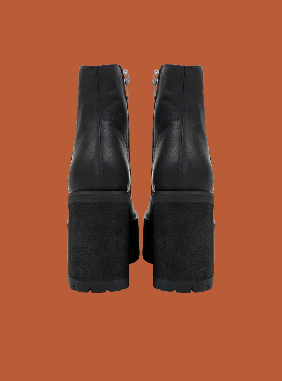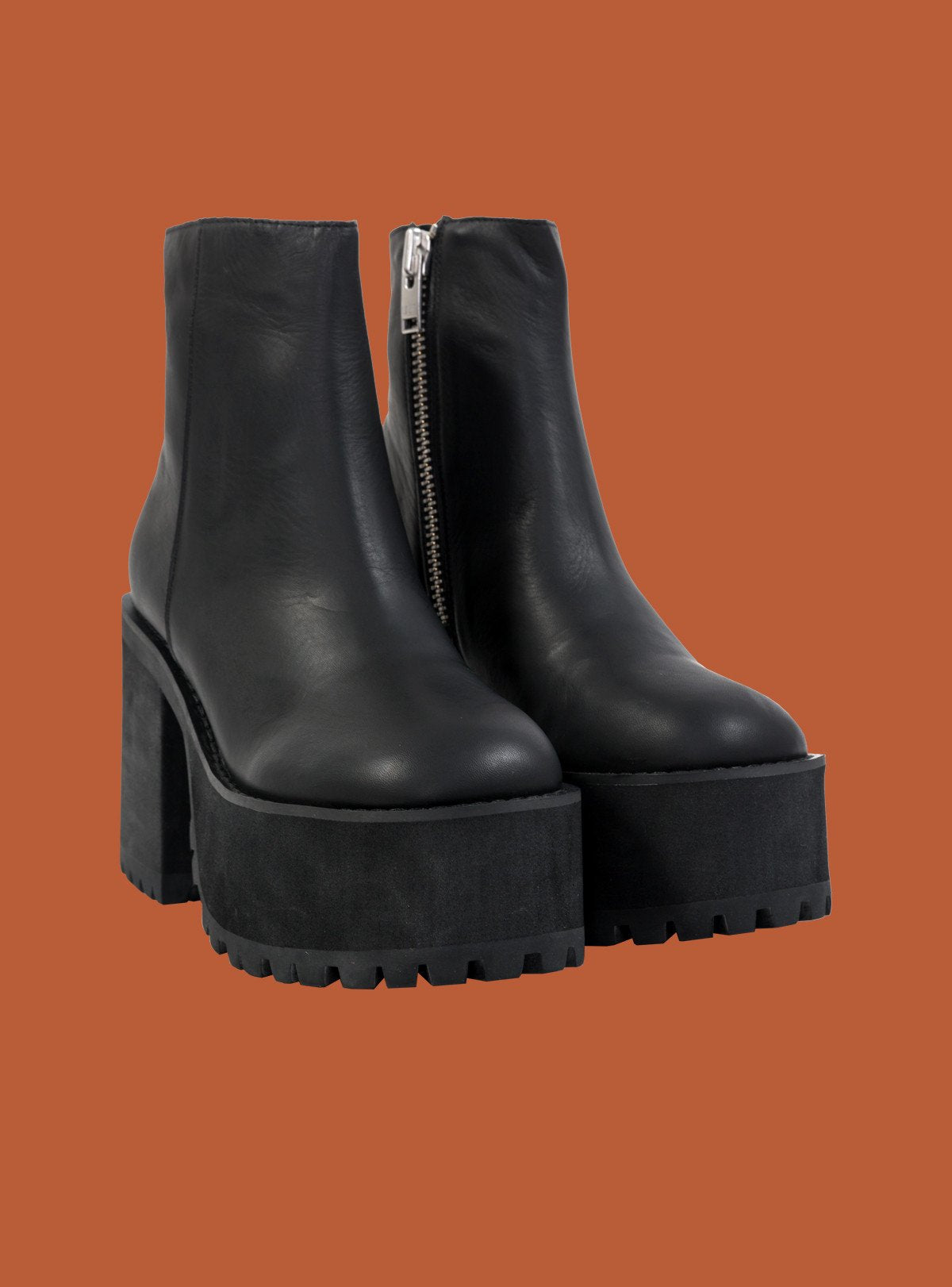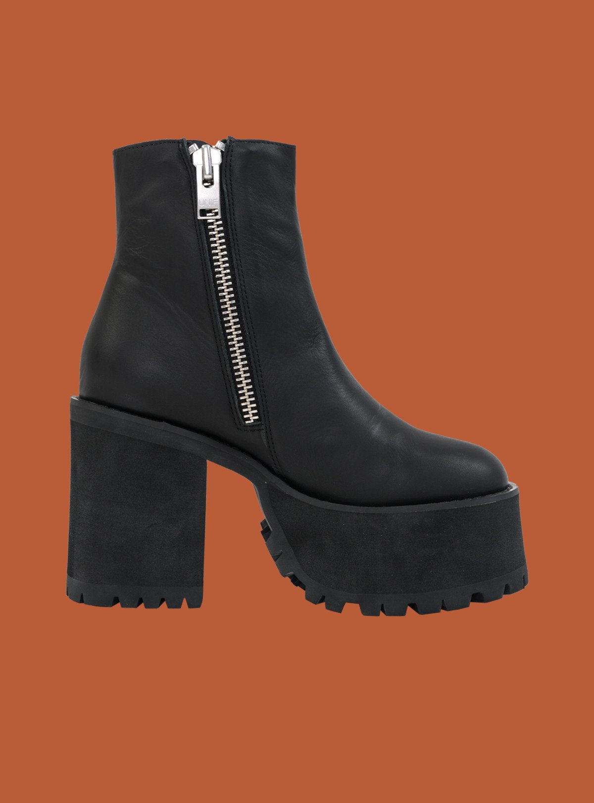 Leather Ankle boot features inside zipper with heavyweight branded pull, stacked dense foam platform with rubber sole.